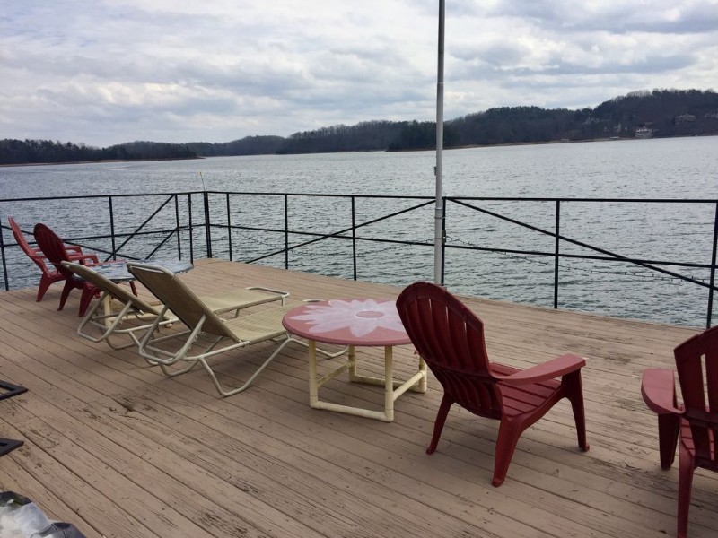 The dock is a two slip dock that has a party deck up top with table, chairs that seat 6 and extra large umbrella for those that want some cover from the sun. For those wanting sun, lounge chairs are provided to catch some rays.
